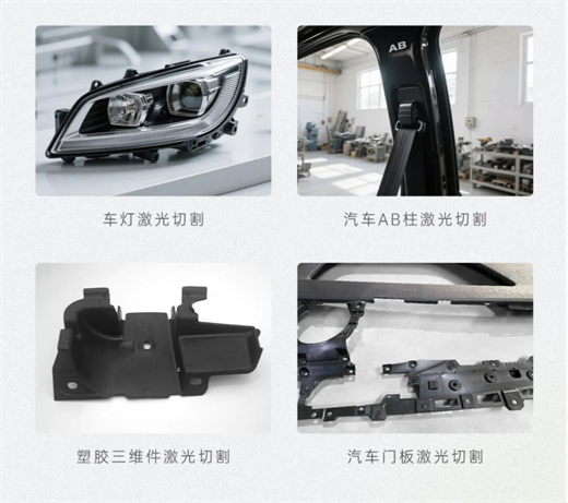 适用于复杂的多面或曲面车灯、电池盖板、汽车门板、前后左右侧梁、AB柱、顶棚等产品,三维高精度水口切割、修边、开孔等高精度加工。