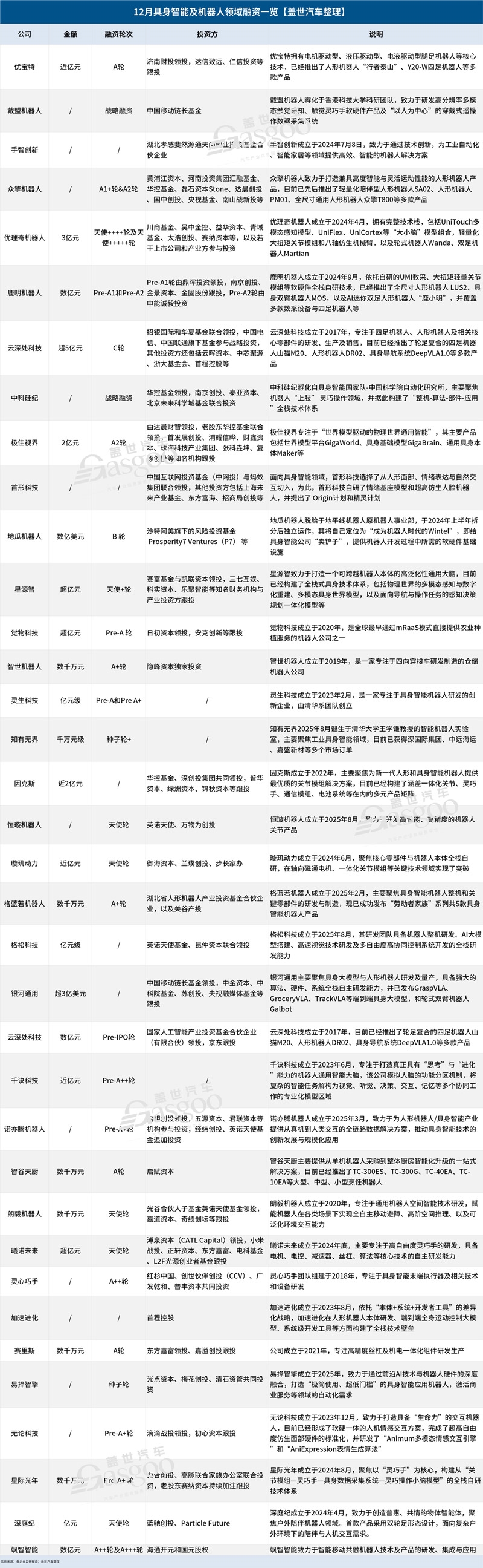 据盖世汽车统计,12月国内机器人及相关核心技术领域已知披露融资事件36起。尽管部分交易未公布具体金额,但仅就已披露规模估算,当月融资总量就已逼近百亿人民币,其中不乏十亿级大额融资。