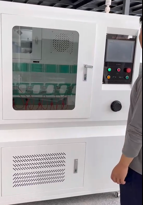 漏电起痕试验仪试验将玻璃皿移开,放回试品到托盘上,并将两电极放到试品上,可用量规检查电极之间是否为4mm,然后关门,按并检查电压表电压是否符合试验电压,否则调节“电压调节"旋钮使电压达到试验值。按“启动试验程序",试验开始。试品在试验期间如电流大于0.5A,连续时间超过2S,继电器动作自动切断电源并指示不合格。如出现试品起火燃烧也应人工终止试验(按“停止"或切断电源)